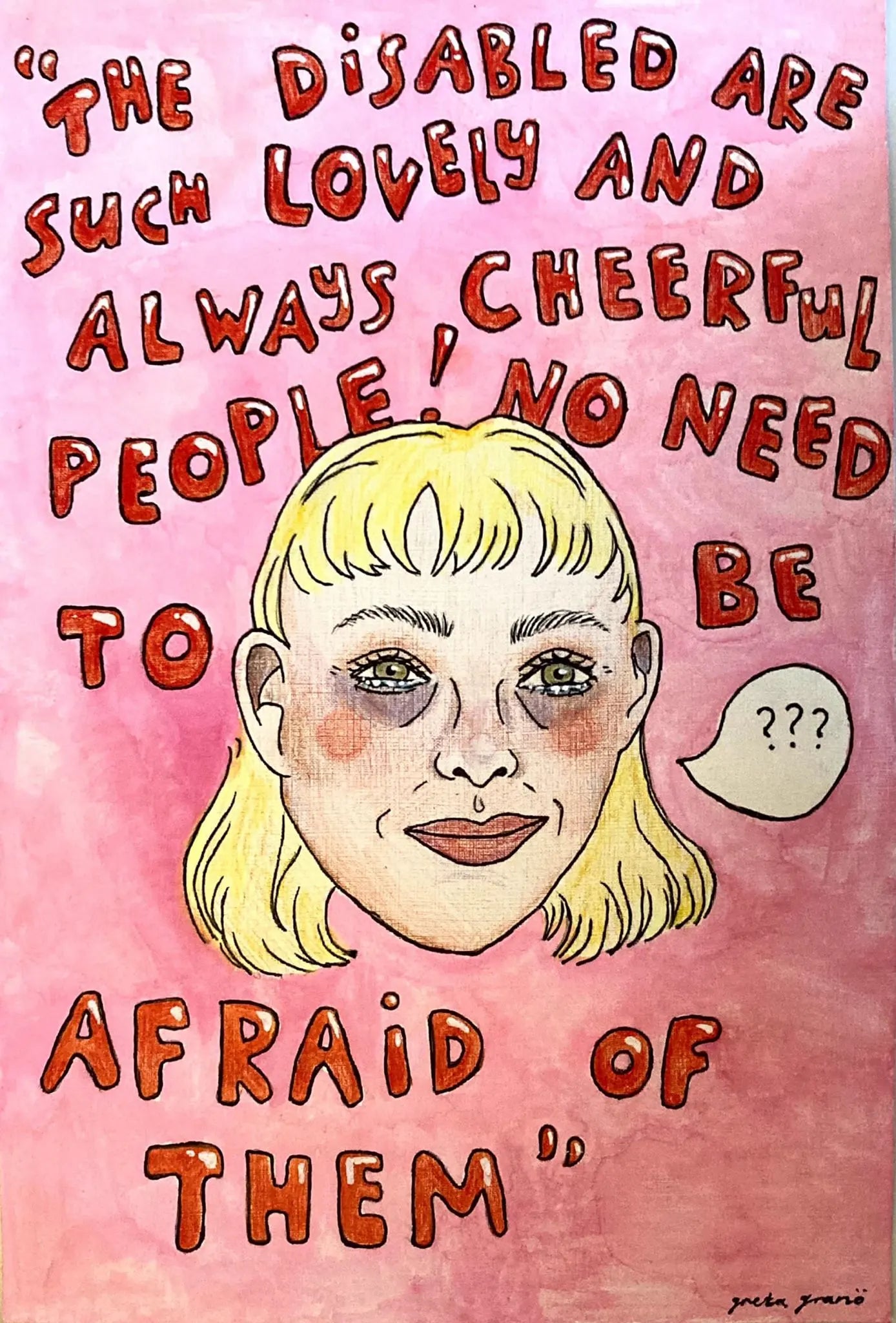 Eikö Suomi siis olekaan tasa-arvon mallimaa? Eivätkö vammaisten asiat ole täällä aika hyvin? Enkö ole iloinen siitä, mitä minulla on? Eivätkö vammaiset ylipäänsä ole iloisia ja herttaisia? Moni ihminen varmasti ajattelee, että valitan tässäkin turhasta. Saatan jopa ärsyttää heitä.