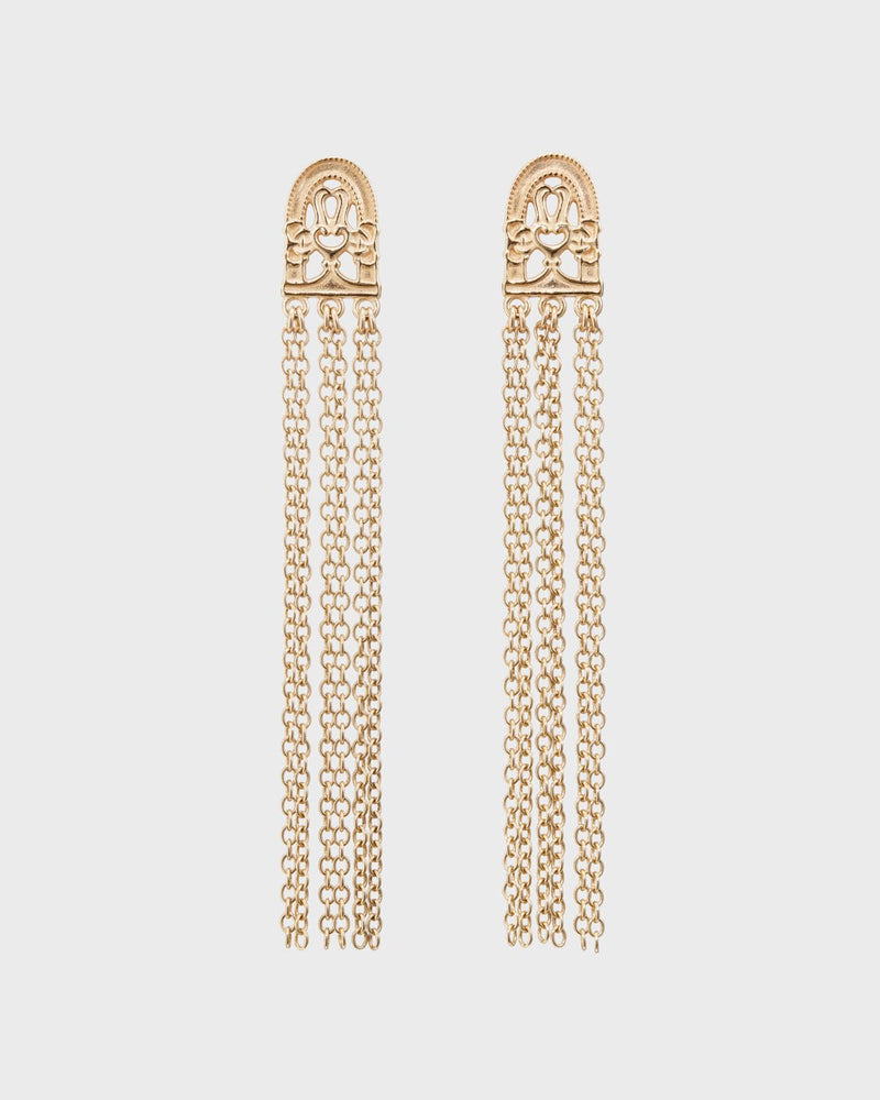 Vanhan klassikon uusi tulkinta. Korvakorun holvikaaren muotoisesta kauniisti kuvioidusta laatasta riippuu kuusi pitkää rinnakkaista ankkuriketjua. Korvakorut ovat kirkasta pronssia. Tappikiinnitys, tappi ja taustanasta hopeaa. Korvakorut ovat saatavissa myös hopeisina.