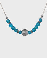 Afrikan aika -kaulakorussa hehkuvat Ghanassa käsityönä kierrätyslasista tehdyt sinivihreät lasihelmet. Jokaisen helmen koko ja muoto on yksilöllinen. Lasihelmiä rytmittävät kauniisti koristellut hopeasta valetut väliosat. Korun keskellä on Halikon käädystä tuttu filigraanipallo. Säädettävä pituus 42/45 cm. Papukaijalukko.
