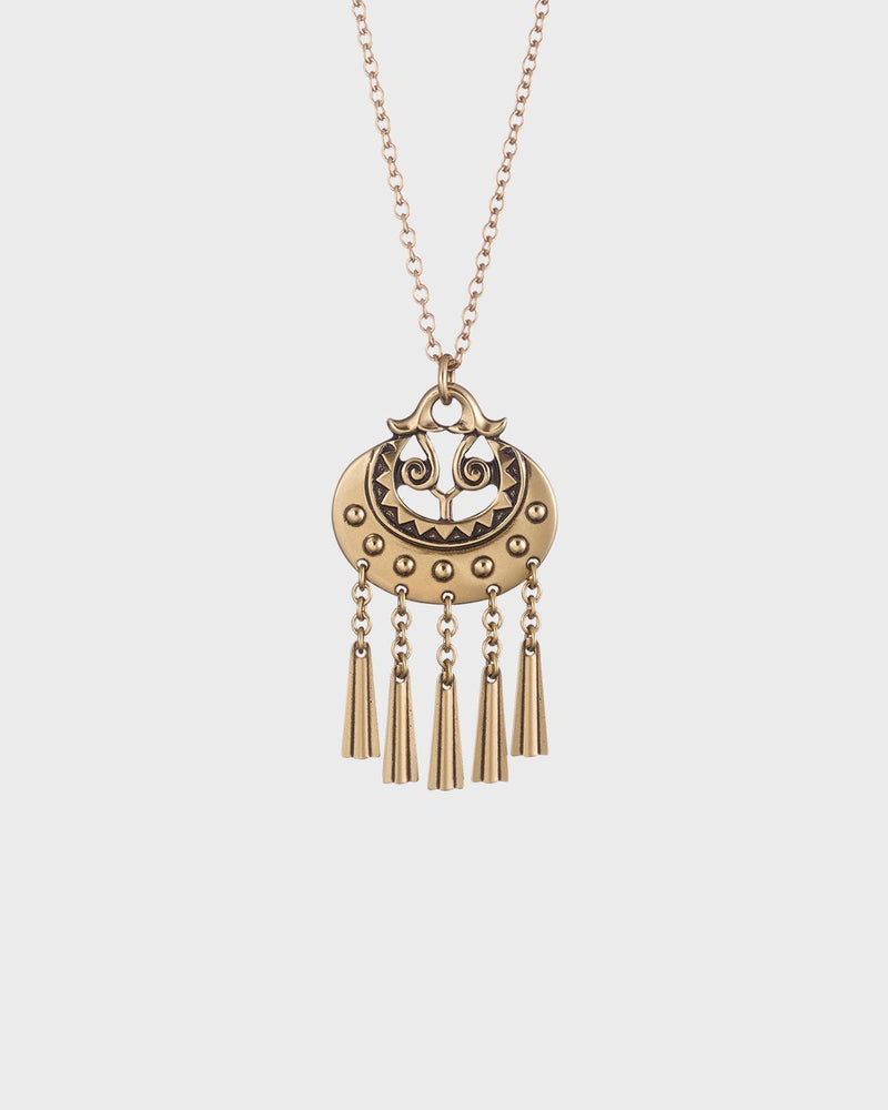 Germund Paaerin 1940-luvulla suunnittelema Kuutar on klassikkokoruistamme se kaikkein ikonisin. Viikinkihenkisen pronssiriipuksen spiraalit symboloivat elämän kiertokulkua, ja pienet helat karkottavat helinällään pahoja henkiä. Ankkuriketjussa säädettävä pituus 60/55 cm. Jousirengaslukko. Saatavissa myös hopeisena.