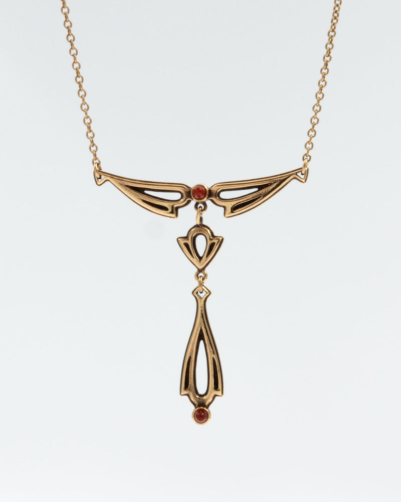 Jugend-henkisen Illusioni-sarjan suunnitteli vuosituhannen vaihteessa kultaseppä Tony Granholm. Korussa hohtaa kaksi punaista karneolikiveä. Ankkuriketju, säädettävä pituus 42/45 cm. Jousirengaslukko. Riipusosan leveys 54 mm.