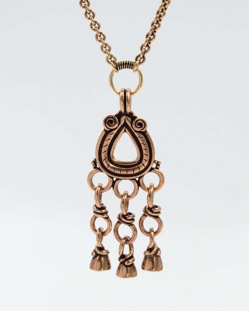 Helisevin kelloheloin koristellun Teuvan riipuksen pronssinen esikuva on peräisin 1000-luvulta, ja se on löydetty Teuvan Lautamäestä. Malli on kulkeutunut Suomeen idästä - se on tyypiltään samanlainen kuin korut, joita Keski-Venäjän suomensukuiset kansat valmistivat pari vuosisataa aiemmin. Kalevala Korun mallistoon Teuvan riipus on tullut 1960-luvulla, ja sitä valmistettiin vuosituhannen vaihteeseen saakka. Ankkuriketju 70 cm, ei lukkoa. Riipuksen leveys 29 mm, korkeus (riipuslenkkeineen) 80 mm.