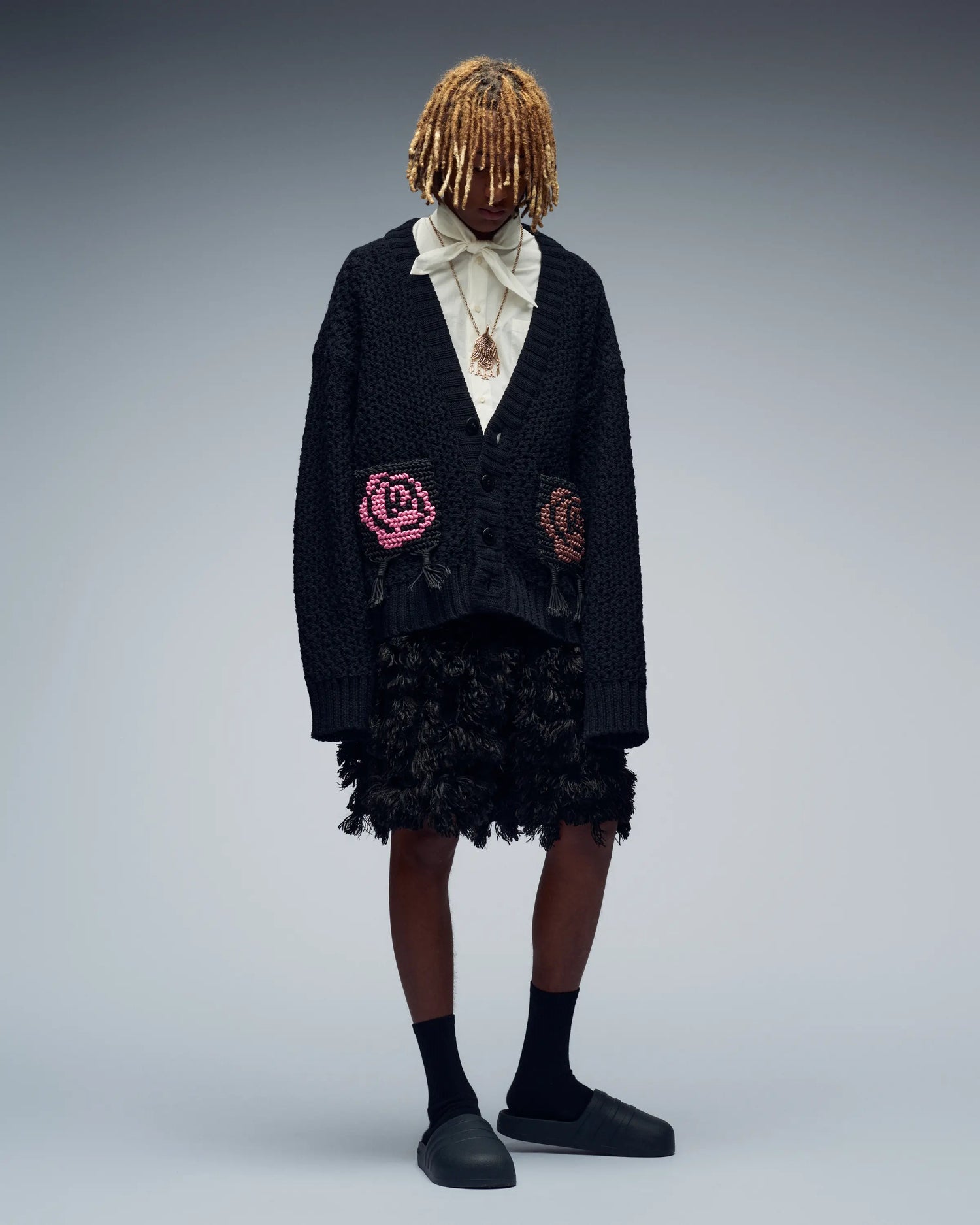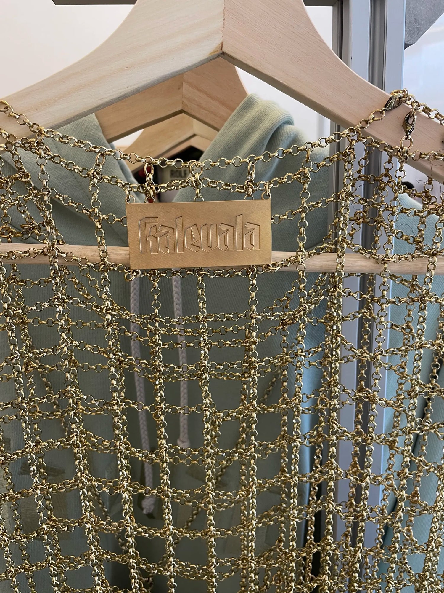 The key piece of the collection and of the Copenhagen fashion show is a hand-woven dress from Kalevala bronze chains, which weighs 2.5 kilos and took around a hundred working hours to make. When juxtaposed against a dark under dress, the garment reveals a lace-like rose pattern. The rose theme is seen throughout the whole collection in various forms.