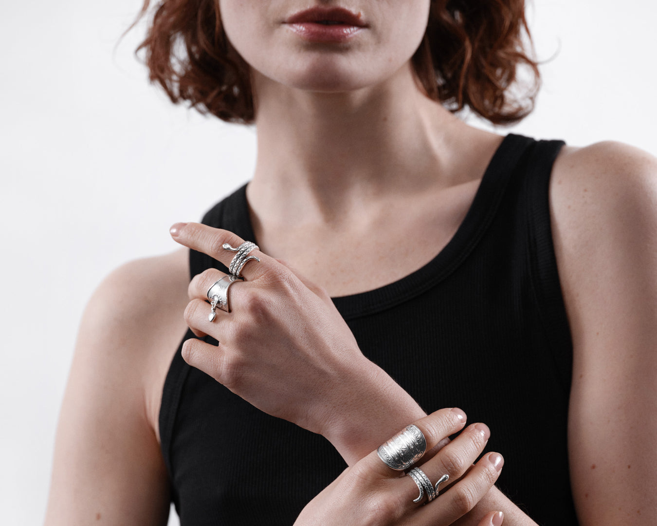 An oath to power and courage. Snakes were believed to be immortal because they shed their skin. Featured in jewelry, the snake symbolised success and the course of life. A snake ring also symbolised power and courage. This ring is based on the model of a ring, found in Vesilahti in the Pirkanmaa region, dating back to the 7th century AD. The spiral has cross-stitch ornamentation and easily recognisable snake-shaped motifs at both ends.
