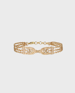 New interpretation of an old classic. The vault-shaped plates adorning the delicate bracelet are patterned on both sides. Adjustable length 16,5 – 19,5 cm. Lobster clasp. Bright bronze, also available in silver.