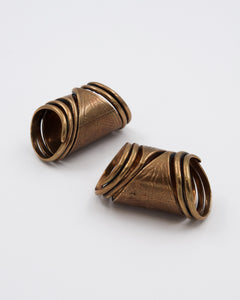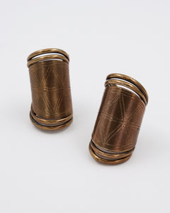 The wide shield rings of Eura's ancient costume are patterned with carved decorations. The bronze rings are similar to each other.