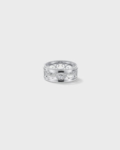 Golden rings have been gifted and worn as a symbol of eternal love for centuries. Rings with skillfully made lace-like filigree patterns were popular amongst the Swedish ruling class in the 18th century. Some of those rings found their way to the prosperous coastal cities of Finland as, at the time, the country was a part of the Kingdom of Sweden. These rings have been used as a model for many pieces of jewelry in the Kalevala Koru collection since the 1960s. Their timeless beauty stirs deep emotions from generation to generation. The wide Filigree ring is adorned with a beautifully cut 0,06 ct diamond. Of even width and thickness, the ring is easy to combine with other Kalevala Love rings. The symbol of the Kalevala Love collection, a heart based on a Viking Age motif, is engraved on the inside of the shank. White gold, also available in yellow gold.