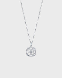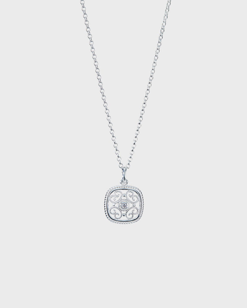 The silver pendant with delicate lace-like pattern is adorned with a sparkling brilliant cut clear cubic zirconia. The length of the delicate oval pea chain is adjustable (50/45 cm). Spring ring clasp.