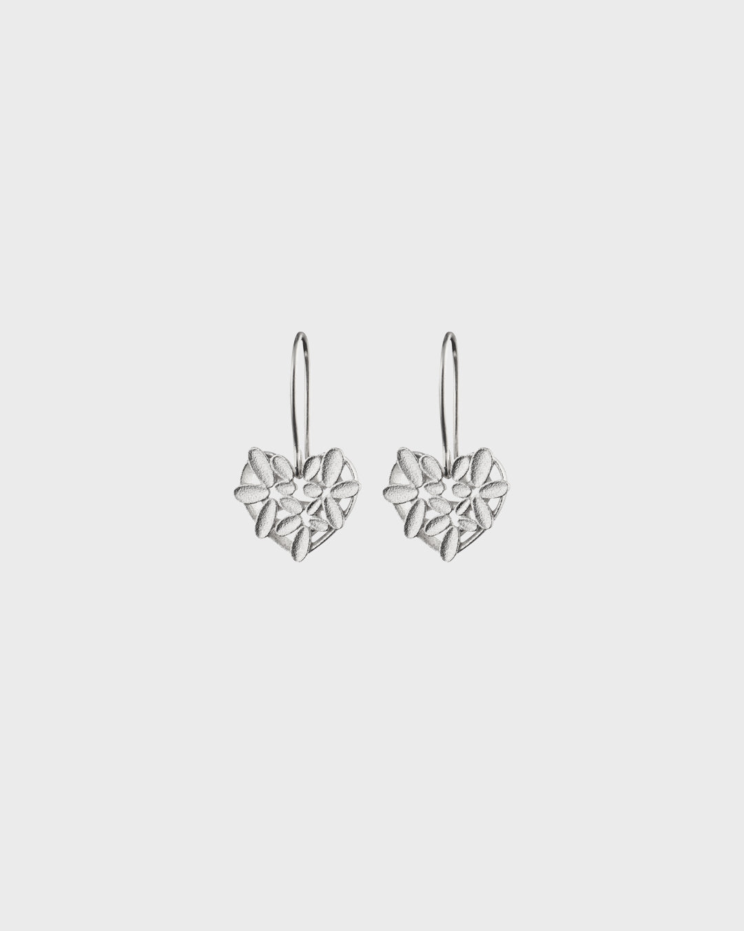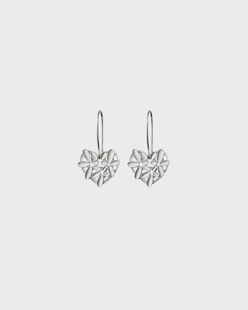 Haaveista totta. Haave kuviosta muotoillut hopeiset Haave sydän-korvakorujen pienistä mattapintaisista silmuista muodostuu herkkä pitsimäinen kudelma.