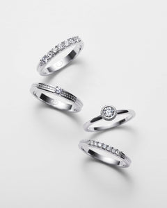 This ring is adorned with a sophisticated cord pattern that originates in a 4th century ring found in Uskela, Southwest Finland. Golden items are rare amongst prehistoric findings in Finland but not entirely unusual. The oldest golden items found their way to the area of present-day Finland in the early centuries of the C.E. also known as the Roman Iron Age. This ancient ring has retained its golden gleam for nearly two millennia. It was made to be everlasting. The Heritage ring is adorned with seven beautifully cut 0,02 ct diamonds set in a row, sparkling like shards of stars fallen from the night sky. Of even width, the Heritage ring is easy to combine with other Kalevala Love rings. The symbol of the Kalevala Love collection, a heart based on a Viking Age motif, is engraved on the inside of the shank. White gold, also available in yellow gold.