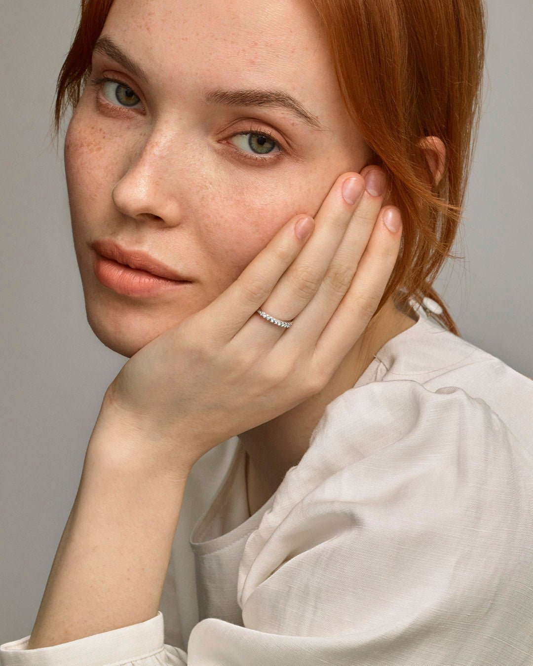 This ring is adorned with a sophisticated cord pattern that originates in a 4th century ring found in Uskela, Southwest Finland. Golden items are rare amongst prehistoric findings in Finland but not entirely unusual. The oldest golden items found their way to the area of present-day Finland in the early centuries of the C.E. also known as the Roman Iron Age. This ancient ring has retained its golden gleam for nearly two millennia. It was made to be everlasting. The Heritage ring is adorned with nine beautifully cut 0,02 ct diamonds set in a row, sparkling like shards of stars fallen from the night sky. Of even width, the Heritage ring is easy to combine with other Kalevala Love rings. The symbol of the Kalevala Love collection, a heart based on a Viking Age motif, is engraved on the inside of the shank. Yellow gold, also available in white gold.