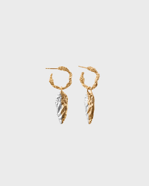 The seed-shaped charms dangling from the hoop earrings are crafted from two interlocking silver elements, one of which is gold-plated. The charms are intricately detailed on both sides. Both the charms and the hoops feature rough, organic surfaces characteristic of the Itu jewelry. The hoops can also be worn on their own without the charms or combine other Itu series charms with the hoops. Both the hoops and the charms are also available for purchase separately. The hoops are made of gold-plated silver.