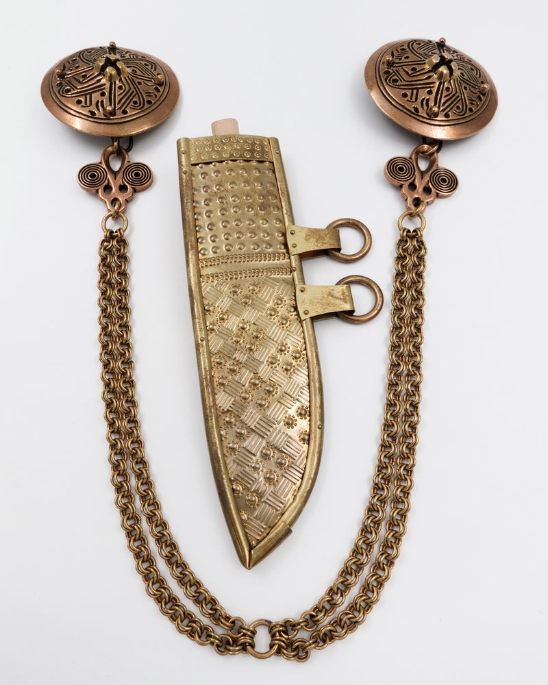 The ornamentation of Kaarina Kirkkomäki's ancient costume includes a chain device with buckles and chain carriers, and a knife with sheaths.