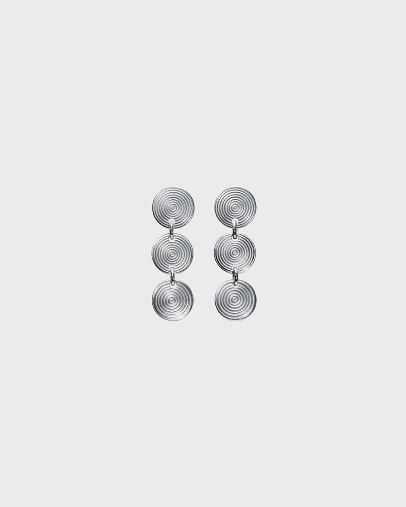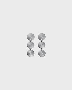 The three-part Kosmos earrings are made of coolly gleaming silver. The three round silver discs connected to each other with small loops are patterned on both sides. Stud fastening on the top disc.