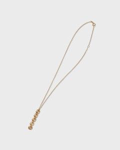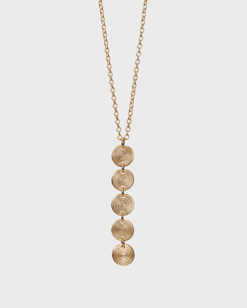 The five-part Kosmos pendant is made of bright bronze glowing like gold. The round bronze discs connected to each other with small loops are patterned on both sides. Anchor chain, adjustable length 42/45/50 cm. Spring ring clasp.