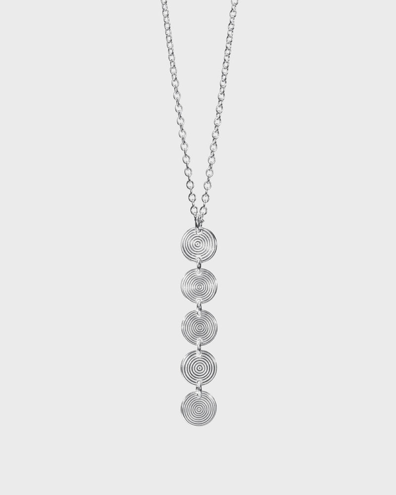 The five-part Kosmos pendant is made of coolly gleaming silver. The round silver discs connected to each other with small loops are patterned on both sides. Anchor chain, adjustable length 43/45/50 cm. Spring ring clasp.