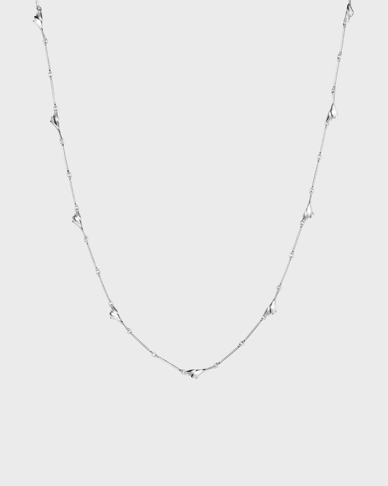 A delicate silver necklace consisting of slender leaf-like elements. Wear it long or wrapped to give you a double strand. This necklace is easy to combine with both casual and formal attires.