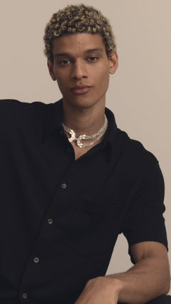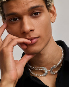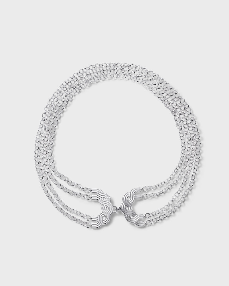 The braided ribbon ornaments of the Maiden of the North silver necklace are connected by four pea chains. The braided ribbon ornaments act as the necklace’s locking mechanism: change the look of the necklace by locking the ornaments behind your neck, at the front or to the side. Length 40.5 cm, not adjustable. Also available as a longer version (47 cm).