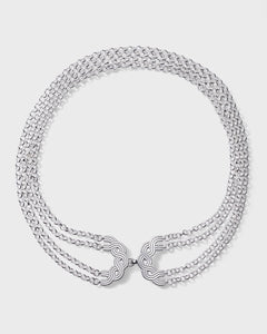 The braided ribbon ornaments of the Maiden of the North silver necklace are connected by four pea chains. The braided ribbon ornaments act as the necklace’s locking mechanism: change the look of the necklace by locking the ornaments behind your neck, at the front or to the side. Length 47 cm, not adjustable. A trendy choker length of 40.5 cm that wraps around your neck is also available.