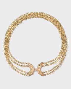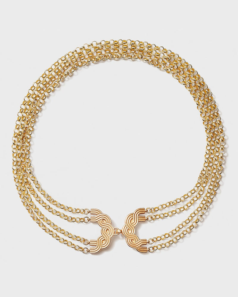 Made of warmly glowing bronze, the braided ribbon ornaments of the Maiden of the North necklace are connected by four pea chains. The braided ribbon ornaments act as the necklace’s locking mechanism, and you can change the look of the necklace by locking the ornaments behind your neck, at the front or to the side. Length 47 cm, not adjustable. A trendy choker length of 40.5 cm that wraps around your neck is also available.