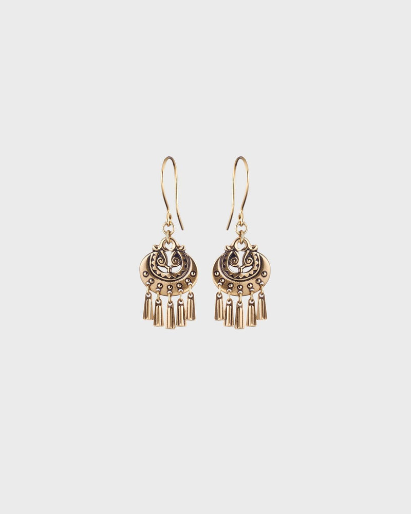 The Moon Goddess designed by Germund Paaer in the 1940's is probably the most iconic among the Kalevala Originals. The spiral motifs on these bronze earrings symbolize the circle of life, and the little tinkling charms cast out evil spirits. Hooks without a lock, made of gold-plated silver. Also available in gold and silver. Also available in larger size.