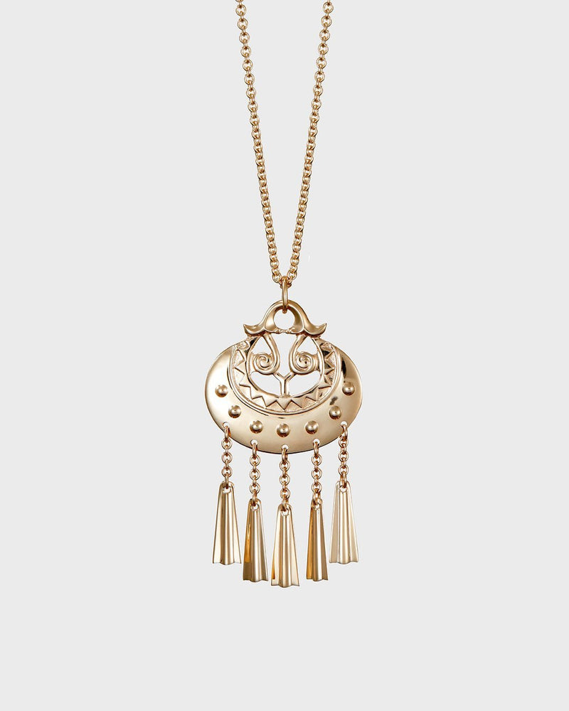 The Moon Goddess designed by Germund Paaer in the 1940's is probably the most iconic among the Kalevala Jewelry Classics. The spiral motifs on this gold pendant symbolize the circle of life, and the little tinkling charms cast out evil spirits. Also available in silver and bronze. Adjustable length 60/55 cm.