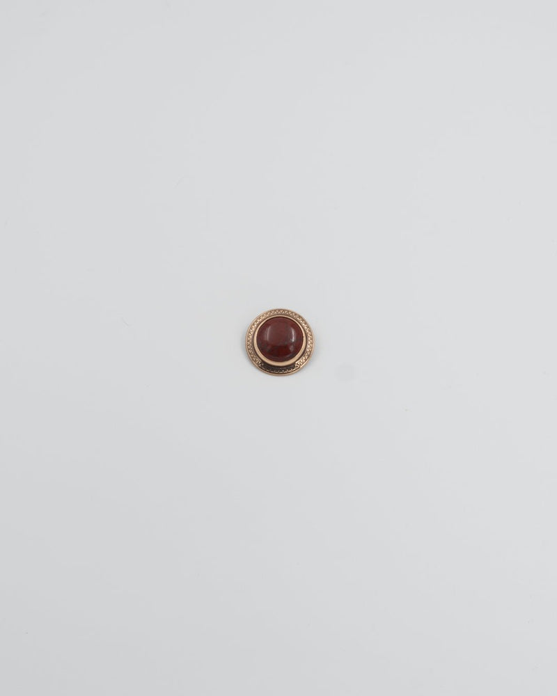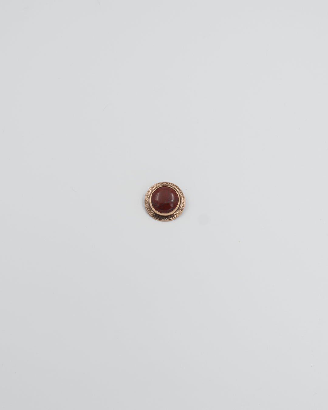 Rintakorun pyöreää kehystä koristaa sahalaitakuvio. Tiilenpunainen kivi suomalaista jaspista. Rintakorun leveys 26 mm.