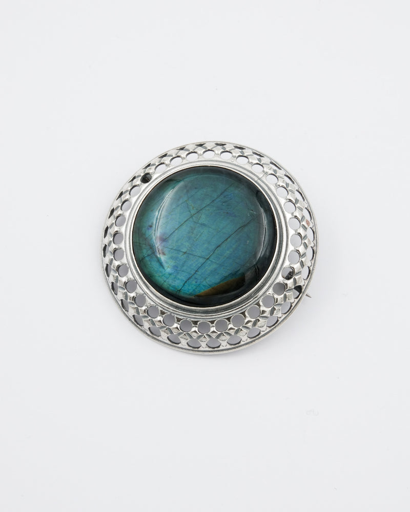 Näyttävän rintakorun kehyksen pitsimäinen koristekuvio on kopioitu hopeisesta rengassoljesta, joka on peräisin Inarista. Koru suunniteltiin 1970-luvulla Rovaniemellä järjestettyjen Kalevalaisten Naisten Liiton Suvijuhlien koruksi. Kivi suomalaista spektroliittia. Leveys 45 mm.