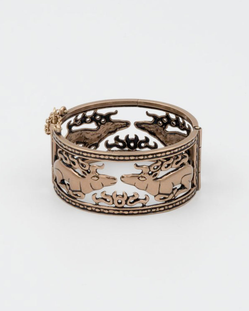 Uljasta sarvikruunua kantava Hiidenhirvi kuului hopeaseppä Kaisaleena Mäkelän suunnittelemaan laajaan Alkuaika-sarjaan, joka ammensi innoituksensa suomensukuisten kansojen rautakaudella käyttämistä eläinaiheisista koruista. Alkuaika-korut tulivat myyntiin 1990-luvun loppupuolella. Näyttävän Hiidenhirvi-rannekorun leveys on 30 mm. Saranoitu, lukkotapissa varmuusketju.