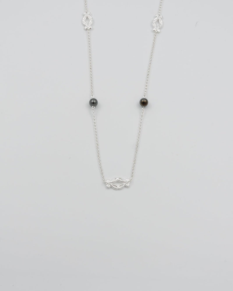 Kultaseppä Mari Saaren suunnittelema kepeä Iris julkistettiin keväällä 2008. Hopeista papuketjua rytmittävät kaksipuoliset kuvioidut hopealaatat ja neljä tummanharmaata metallinhohtoista hematiittihelmeä. Voit käyttää korua pitkänä kaulaketjuna tai kiepauttaa sen kaksinkerroin kaulallesi. Ketjussa on papukaijalukko.