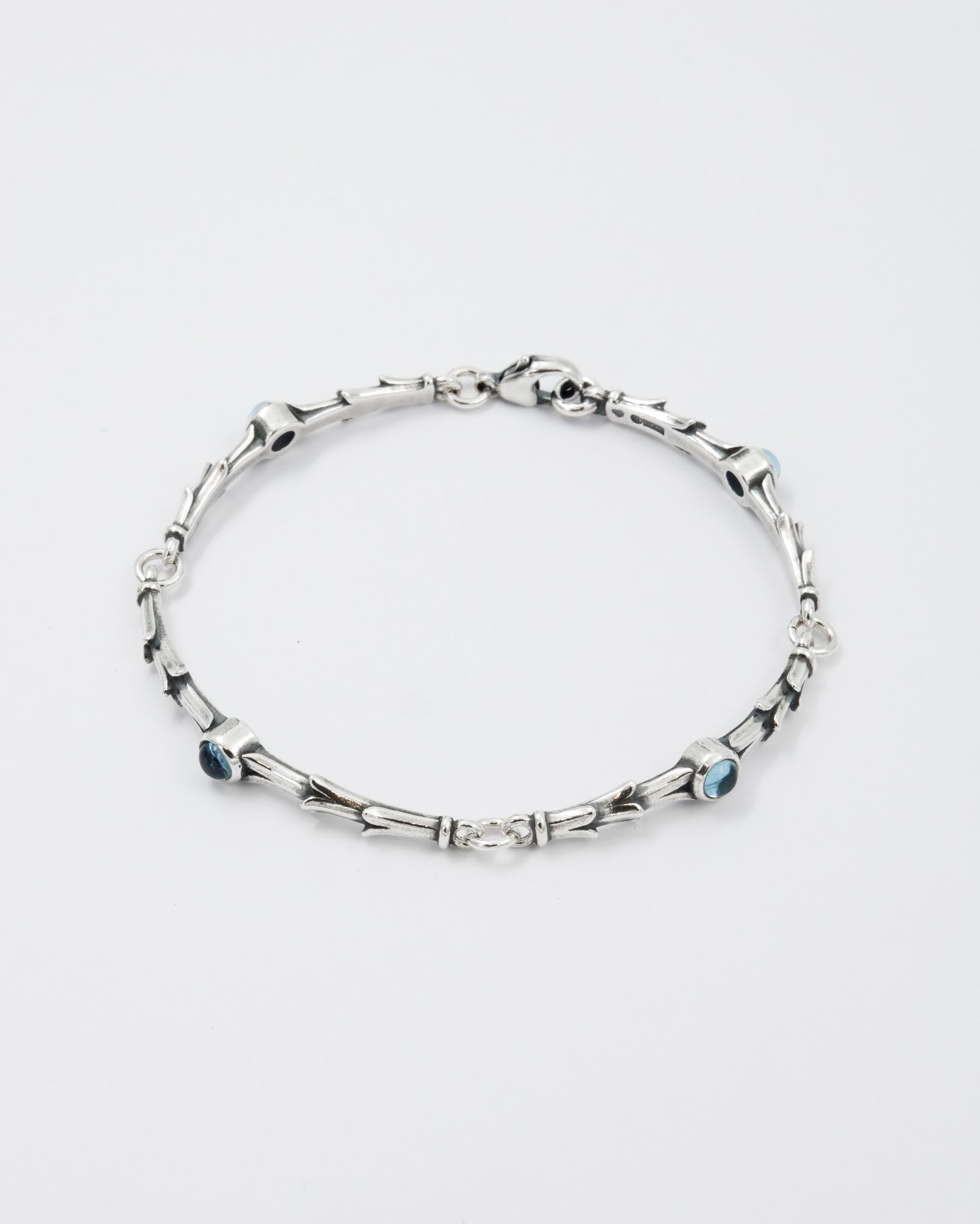 Juulia jewelry designed by Tony Granholm is inspired by ancient victory wreaths. Light blue topaz shines in silver Juulia jewelry. The bracelet has a parrot lock.