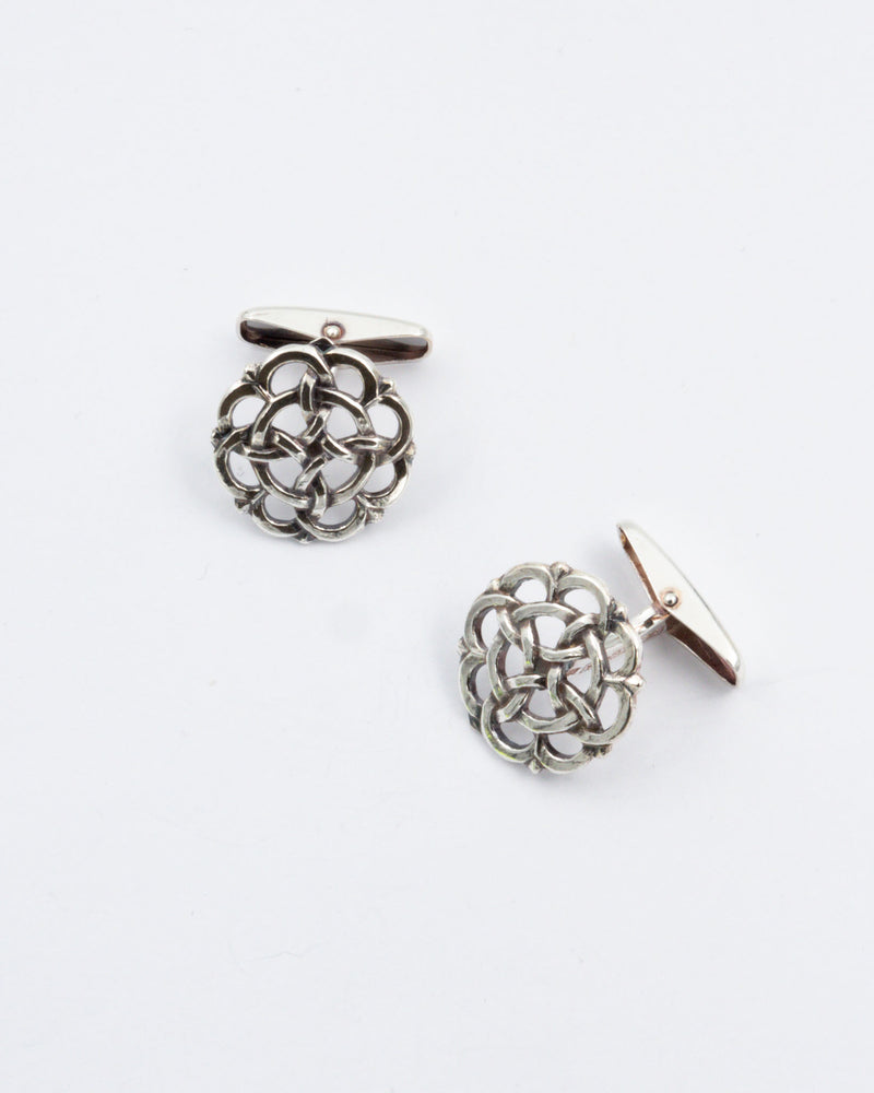 Viehättävät nauhapunosaiheiset kalvosinnapit perustuvat taiteilija Germund Paaerin 1940-luvulla suunnittelemaan korvakoruun. Hopeaa, koristeosan halkaisija 20 mm.
