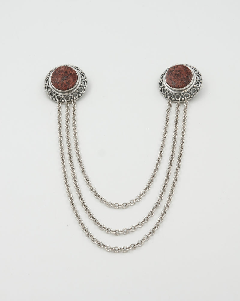 Beautifully polished red-brown granite stones are attached to the round buckles of the necklace. The jewelry was designed by goldsmith Kai Lindström. The diameter of the buckles is 25 mm.