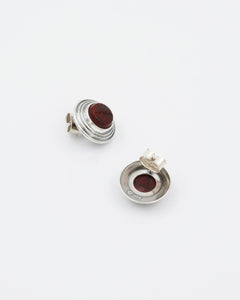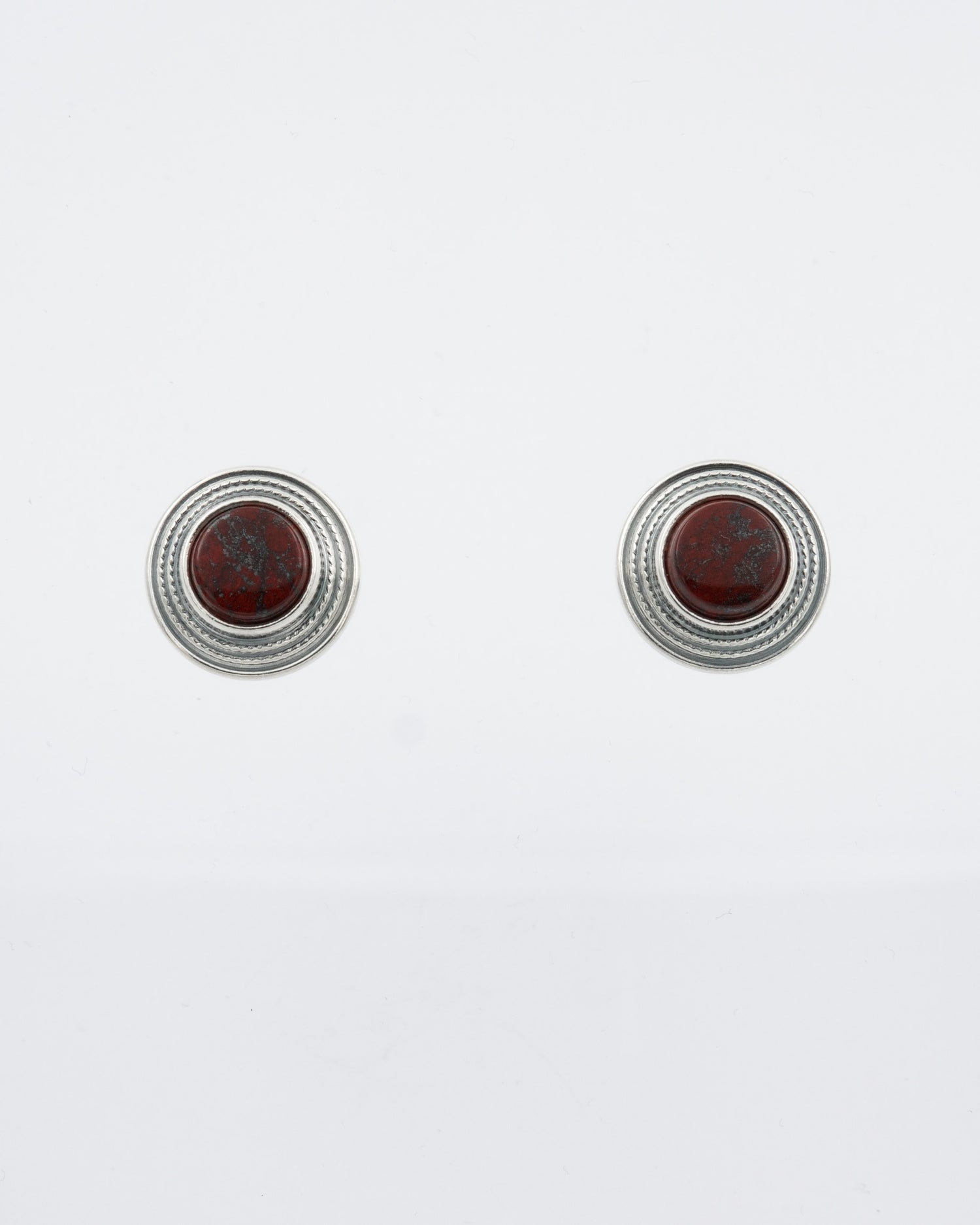 Korvakorun kehyksen koristeaihe on 1800-luvulla valmistetusta kultaisesta soljesta, jonka Aurora Karamzin lahjoitti Träskändan kartanon opettajattarelle. Hopeaa, tiilenpunainen kivi suomalaista jaspista. Korvakorun halkaisija 18 mm. Tappikiinnitys.