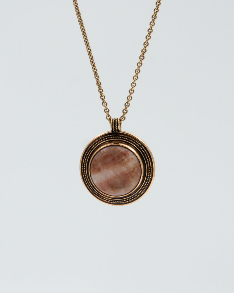 Pyöreän riipuksen kehyksen koristeaihe on 1800-luvulla valmistetusta kultaisesta soljesta, jonka Aurora Karamzin lahjoitti Träskändan kartanon opettajattarelle. Pronssia, kivi ruskakvartsi. Ankkuriketju 60 cm, jousirengaslukko. Riipuksen leveys 32 mm.