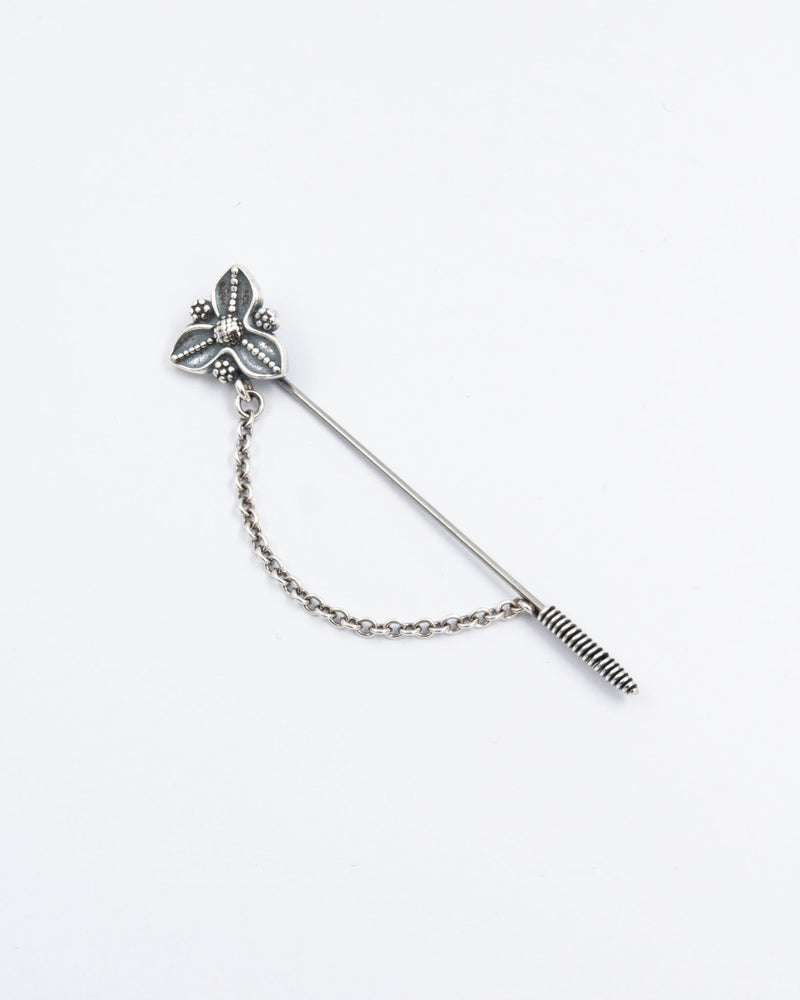 Kalevala Koru avasi syksyllä 1997 korumyymälän Lyypekkiin, Saksaan. Samalla mallistoon tuotiin pieni valikoima koruja, joiden muinaiset esikuvat on löydetty Lyypekin alueelta. Tämän pienen kukka-aiheisen neulan malli on 1200-luvulta. Kukkaelementti, spiraaliputki ja ketju hopeaa, neula terästä.