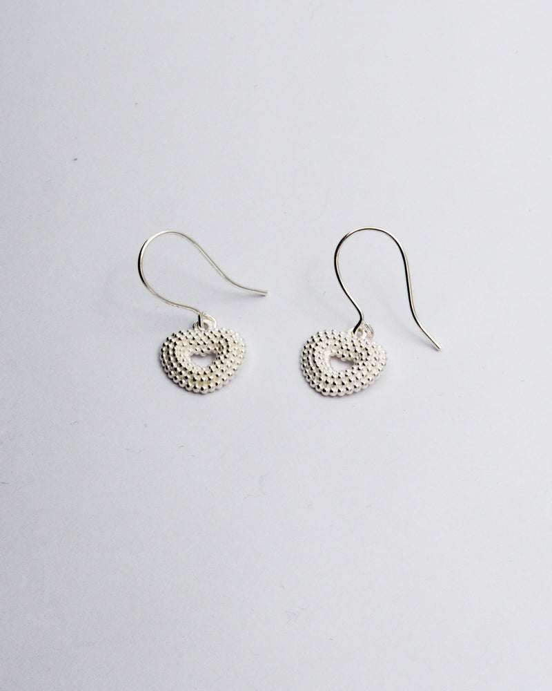 Sydämenmuotoiset Lähellä-korvakorut ovat kultaseppä Tiina Lahtisen käsialaa. Leveys 13 mm, korkeus koukkuineen 28 mm.