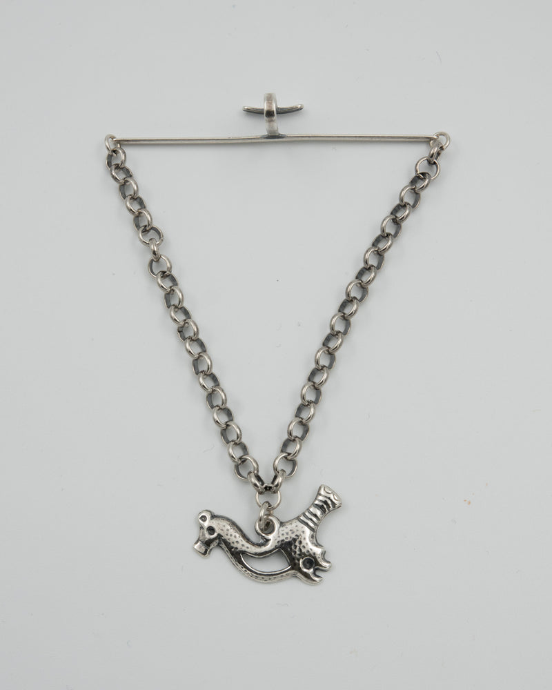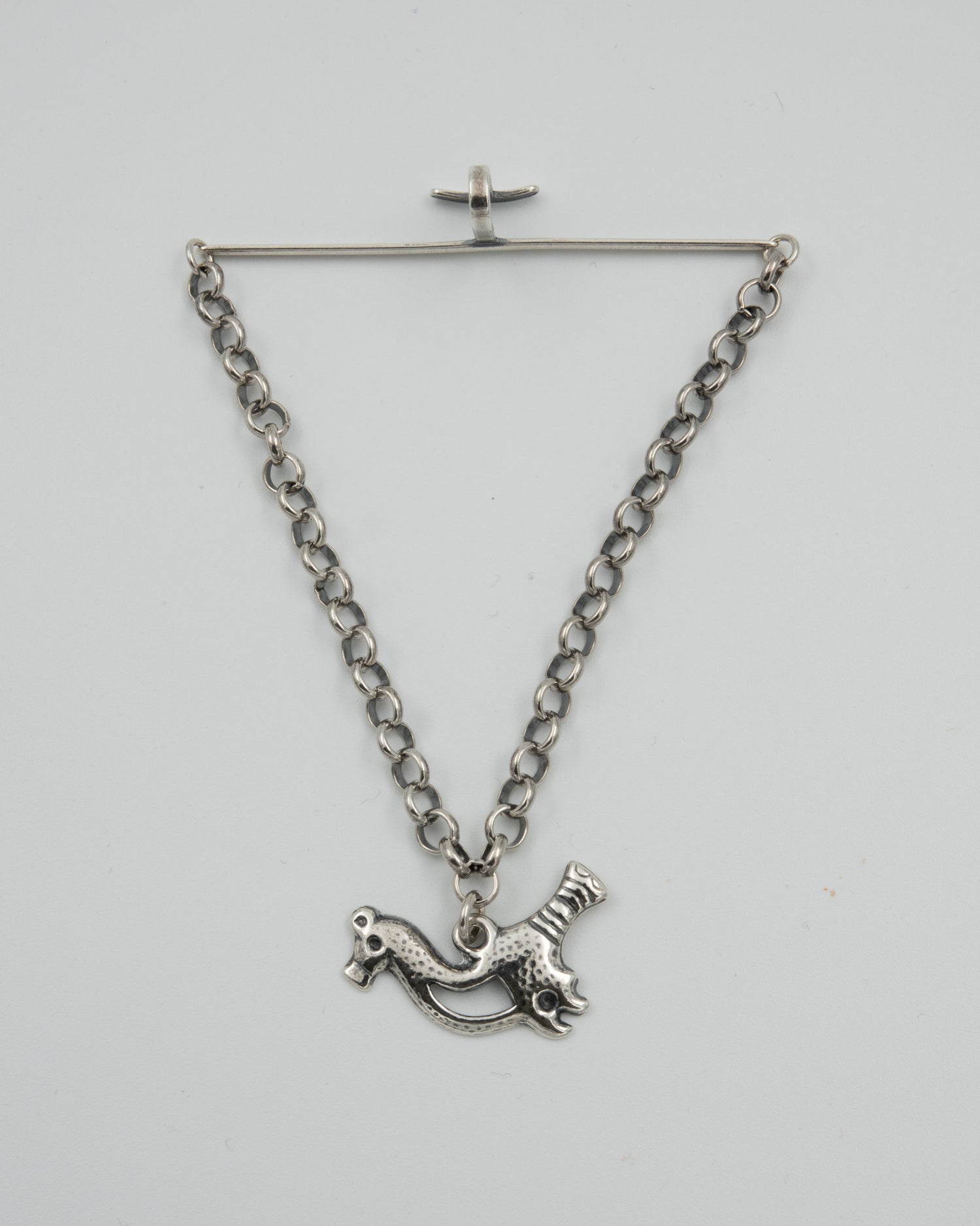 The hook behind the crossbar of the tie holder is threaded through the buttonhole of the shirt and the tie through the crossbar and the chain so that the chain and the bird decoration remain on top of the tie and the crossbar is hidden under the tie. Silver, the bird is smooth on the reverse side.