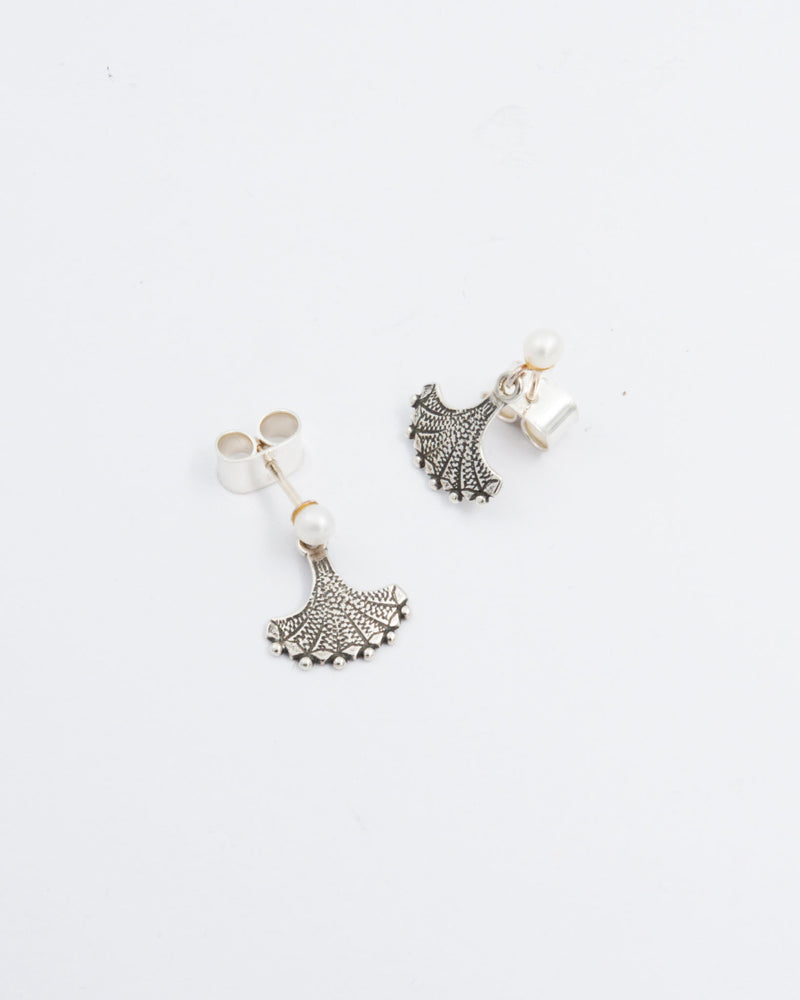 Hopeaa, valkoinen helmi. Tappikiinnitys. Korvakorujen leveys ja korkeus 14 mm. Viuhkamainen riipusosa on nurjalta puolelta kuvioimaton.