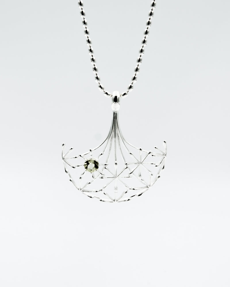 A woman's voice, designed by Kirsti Doukas, which celebrates universal and equal voting rights, has already established its position as a beloved classic of modern Finnish jewelry design years ago. A beautifully polished yellowish-green quartz stone shimmers in the lacy silver structure of the Voice of a Woman pendant. Oval ball chain 40 cm, parrot clasp.
