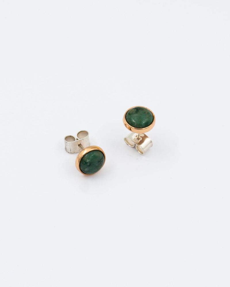A beautifully polished forest green chrome marble is embedded in the gestureless round bronze frame of the Ruska earrings. Pin fastening, pin and back pin in silver.