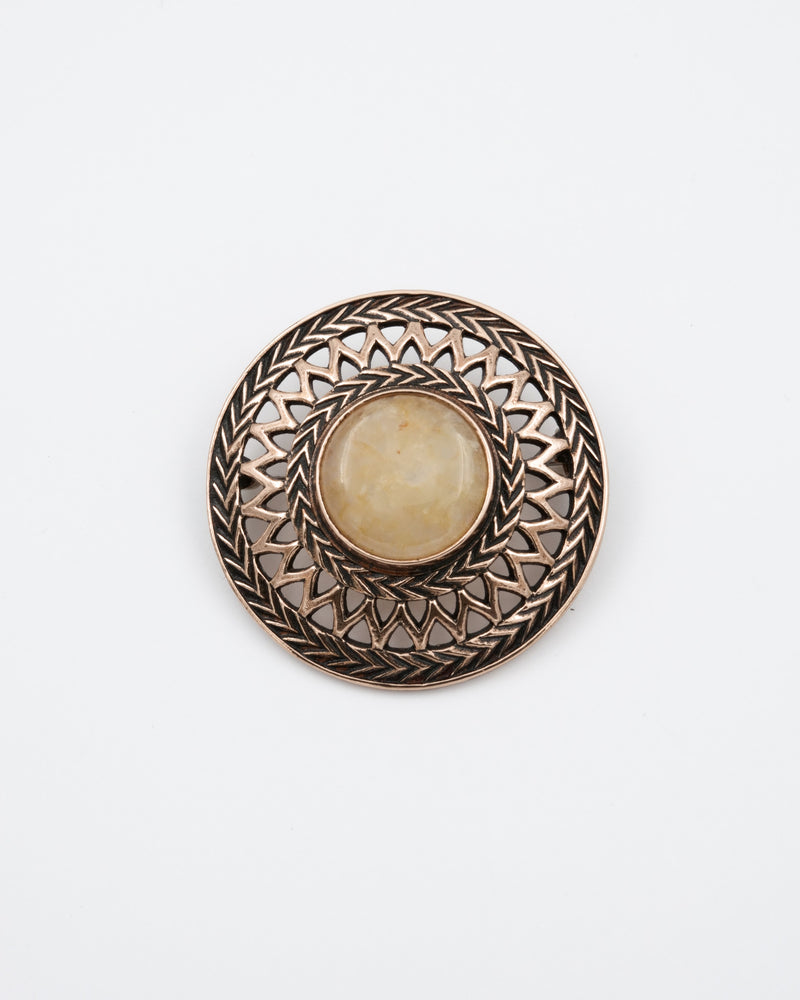 Rintakorun kehyksen esikuvana on ollut kehäsolki, joka on löydetty Uskelan Lukkarinmäestä. Kivi aurinkokvartsi. Rintakorun leveys 44 mm.