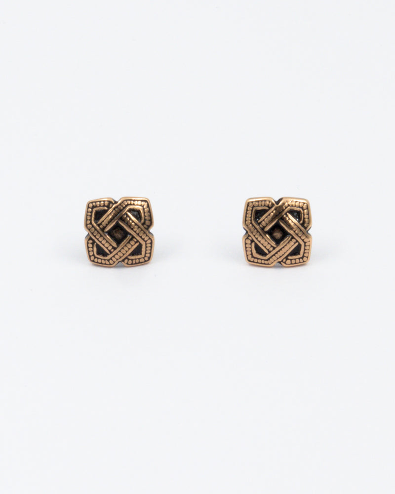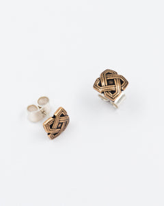 Since ancient times, braided ribbons and knots have been cherished motifs in jewelry across the world. The knot typically symbolizes union, strength, or the bond between people. These small bronze earrings designed by Börje Rajalin in the 1960s feature a knot symbol and were part of the Kalevala jewelry range till 2000s. Width and height 10 mm. Stud fastening, silver stud and back.