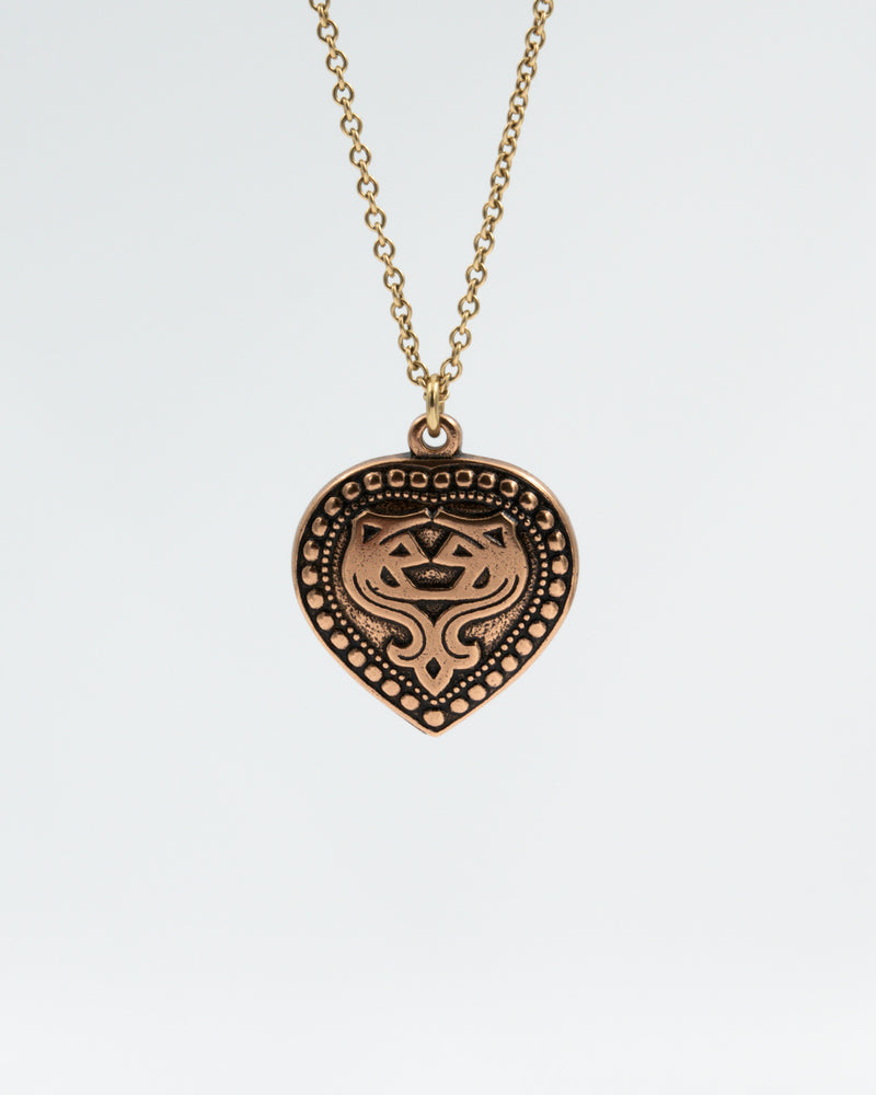 The Viking Age was a prosperous era in Finland, but also a turbulent one. Many valuables -silver coins and jewelry – were buried for safekeeping during this period. This heart-shaped pendant was modelled after a small silver charm that was hidden away in one such treasure trove. Width 27 mm. Anchor chain 60 cm, spring ring clasp.