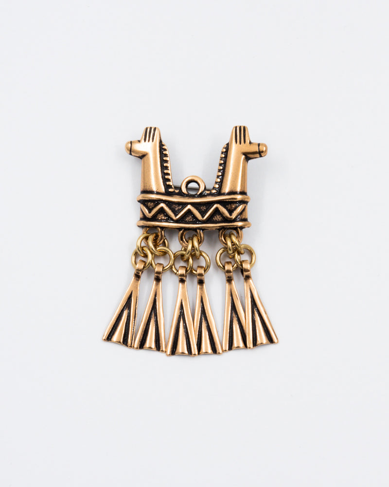 The brooch with two horse heads and six tinkling charms was modelled after an Eastern Finnish bronze pendant dating from the late Iron Age. Tinkling charms were believed to ward off evil spirits and thoughts. The Two-headed Horse was part of the Kalevala jewelry range from the 1950s till the early 2000s. Width 29 mm. Bronze, stainless steel pin.