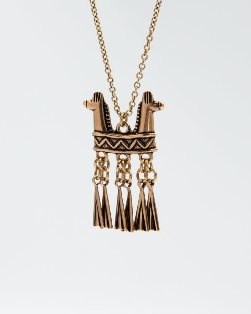 The pendant with two horse heads and six tinkling charms was modelled after an Eastern Finnish bronze item dating from the late Iron Age. Tinkling charms were believed to ward off evil spirits and thoughts. The Two-headed Horse was part of the Kalevala jewelry range from the 1950s till the early 2000s. Width 29 mm. Anchor chain 60 cm, spring ring clasp.