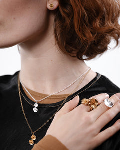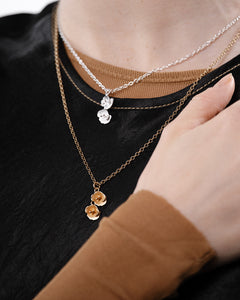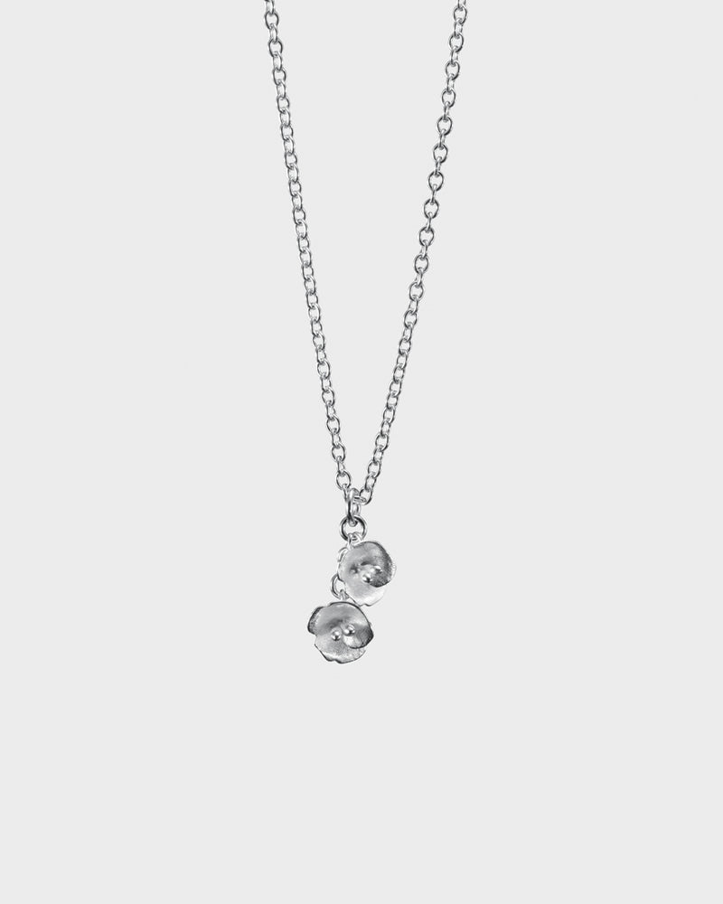 The frail beauty of midsummer roses blooms in the two tiny roses of the miniature Summer Night Rose silver pendant. Anchor chain, adjustable length 42/45/50 cm. Spring ring clasp. Also available in bronze and gold.