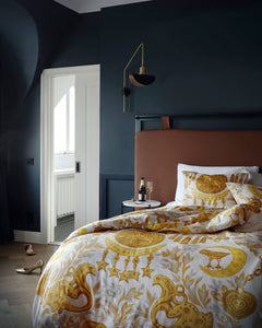 Vallila x Kalevala collaboration collection's Kuulintu patterns are decorated with Kalevala's beloved jewelry such as Kuutar, Hattula's bird, Aurinkoleijona and Eura's heart.