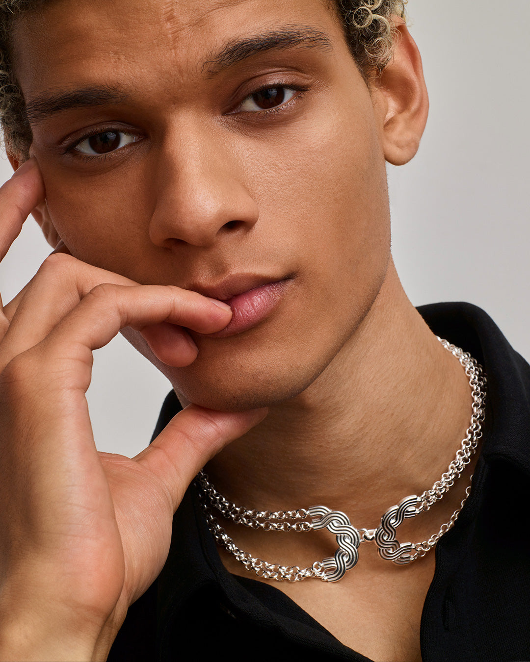 ”Nolla-korusarjan inspiraationa on Suomen uhanalaiset kukat, joiden joukosta löysin Lehtoängelmän. Pidin kukinnon linjoista ja päällekkäisyydestä. Ajattelen samalla luonnon muutosta: Kuinka paljon häviää, ja mitä tulee tilalle? Näkyykö hävinnyt näissä tilalle tulleissa? Oli luontevaa ja innostavaa kokeilla juuri tässä korusarjassa uutta biomateriaalia”, Harmaala Chaloff kertoo.