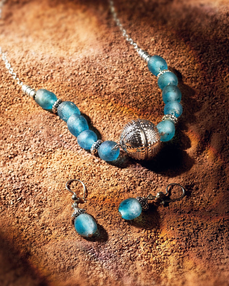 Afrikan aika -kaulakorussa hehkuvat Ghanassa käsityönä kierrätyslasista tehdyt sinivihreät lasihelmet. Jokaisen helmen koko ja muoto on yksilöllinen. Lasihelmiä rytmittävät kauniisti koristellut hopeasta valetut väliosat. Korun keskellä on Halikon käädystä tuttu filigraanipallo. Säädettävä pituus 42/45 cm. Papukaijalukko.
